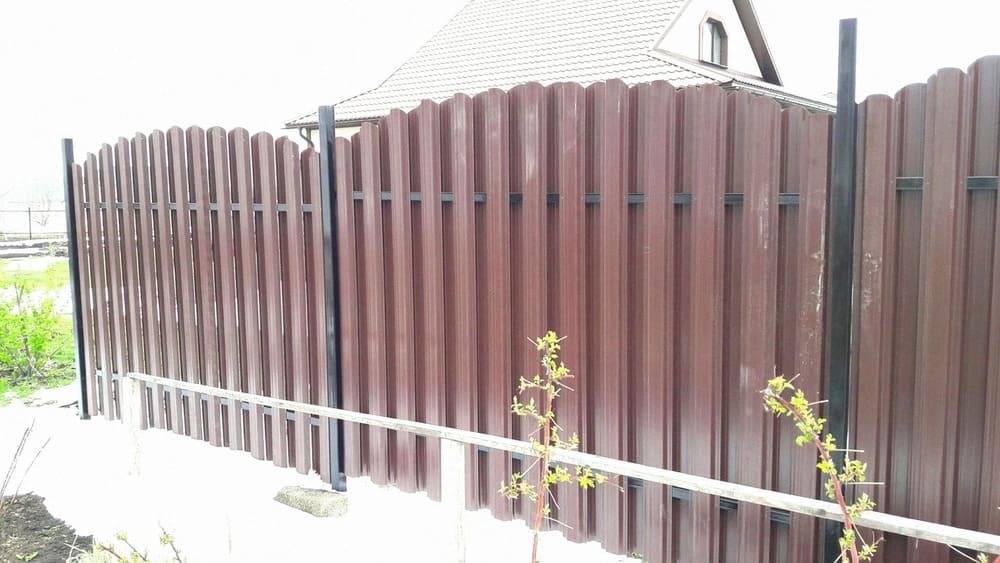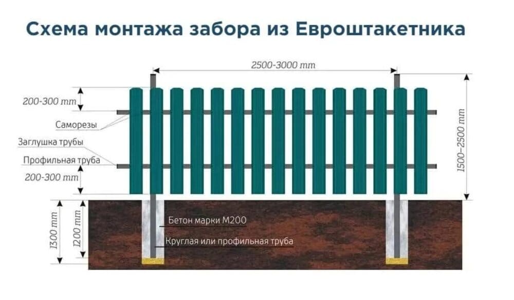 Количество столбов – расстояние между ними 2–3 м (чем тяжелее штакетник, тем чаще опоры).
