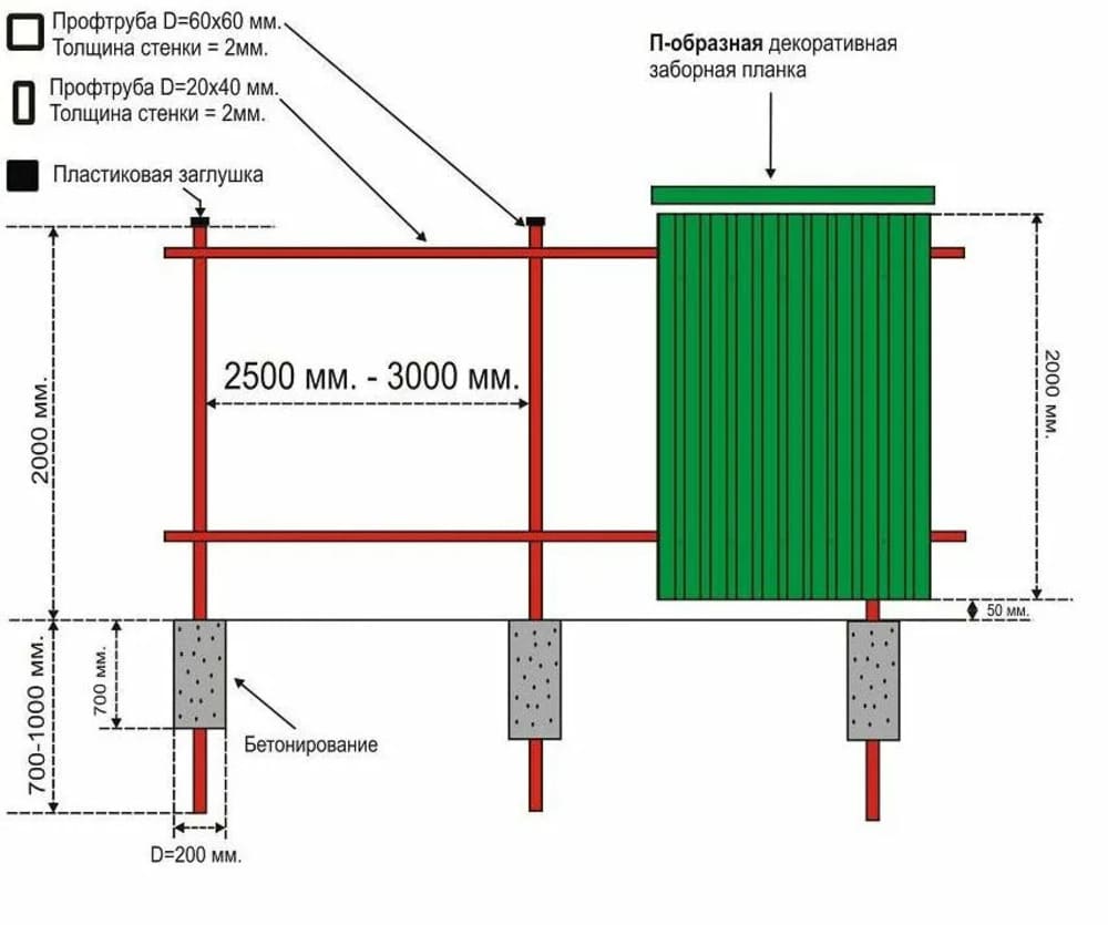 — Если забор имеет дополнительные нагрузки (например, он из сетки рабицы или оснащен навесами), следует увеличить глубину заложения столбов.
