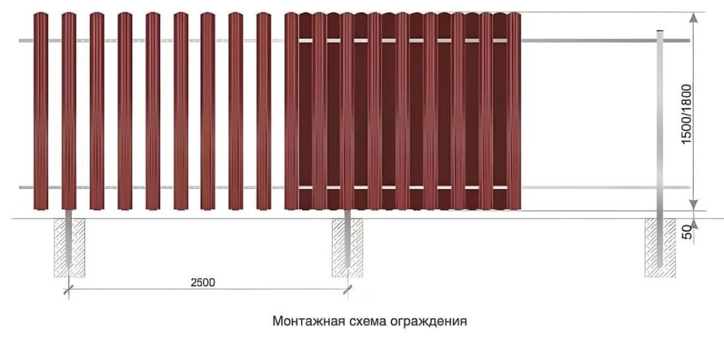 — Опоры. Для высот до 1,5 м достаточно металлических профильных труб диаметром 60–76 мм, залитых бетоном на глубину 60–80 см. Для высот 1,8–2,5 м и выше рекомендуется использовать трубы большего сечения с бетонированием на глубину 80–120 см и армированием.